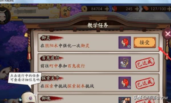 1、首先我们进入阴阳师的庭院,领取御灵的任务,如图所示。